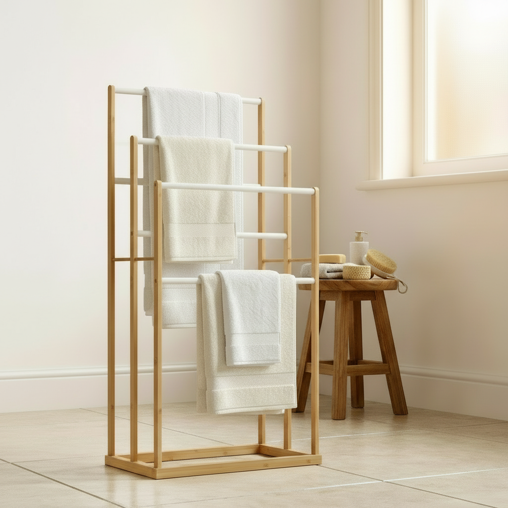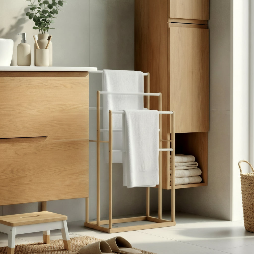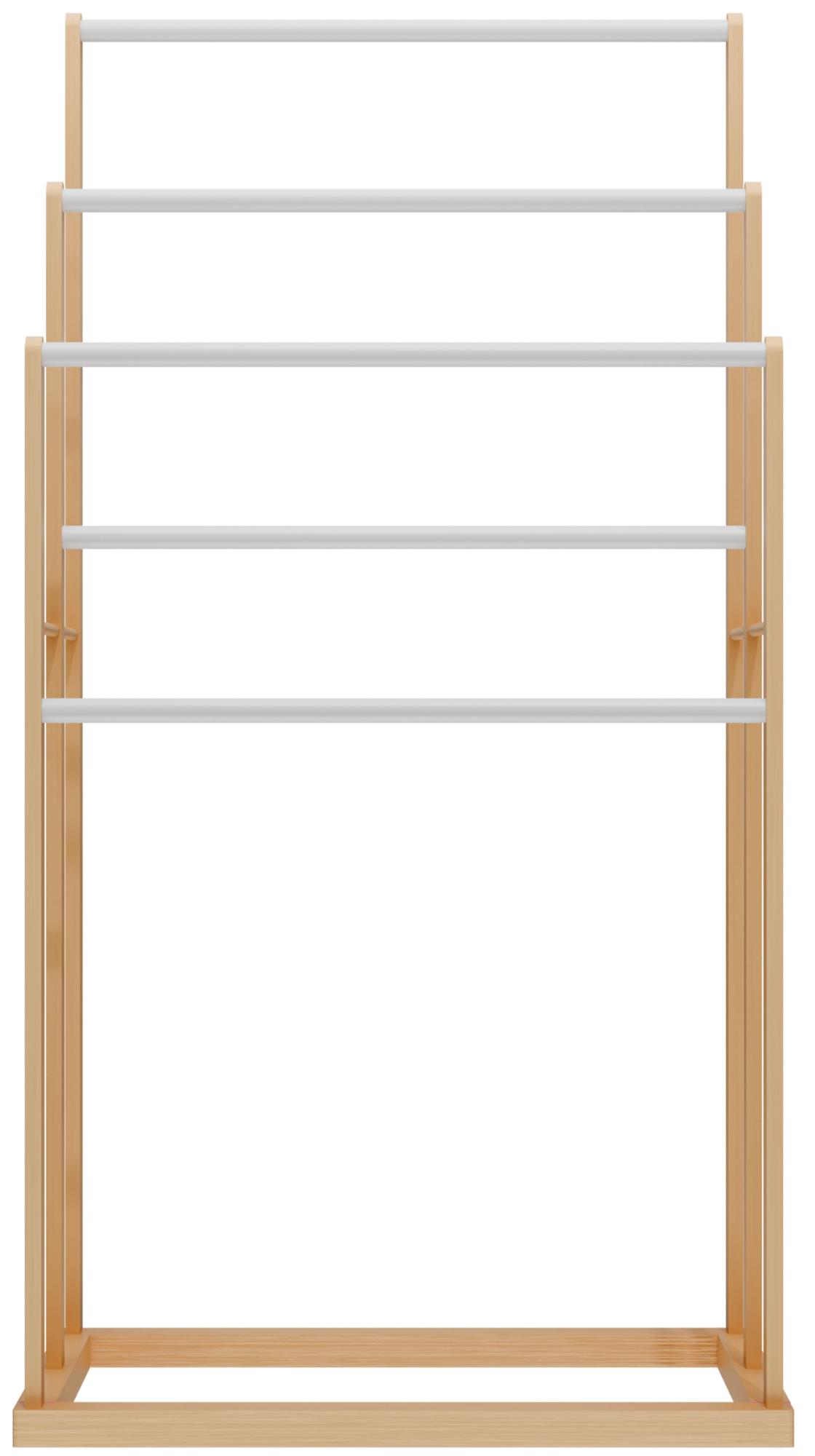De handdoekenrek is gemaakt van duurzaam en stevig bamboe hout met een mooie natuurlijke houtnerf. Bamboe is sterk en geschikt voor vochtige ruimtes zoals de badkamer of sauna. De stangen zijn van roestvrij en corrosiebestendig staal.