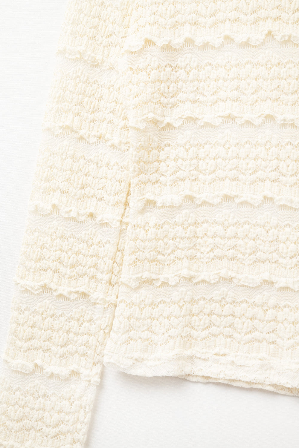 Ontdek de charme van onze bloemenkant top met ronde hals, in een tijdloze crème kleur. Deze romantische top is voorzien van gedetailleerde bloemenkant langs de mouwen en body. Mooi voor een avondje uit met vrienden of date. Of combineer met laarzen voor een festival.