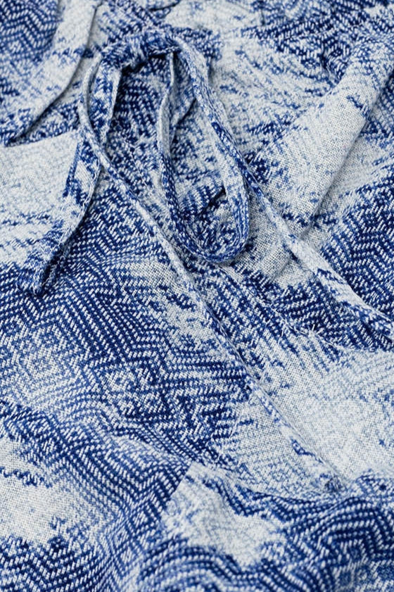 Prachtige boho mini jurk met een abstracte print in tinten blauw en wit. Een romantische jurk voor strandwandelingen, terrasje in de stad of festival. De jurk heeft pofmouwen, een flatterende sweetheart halslijn en speelse touwtjes aan de voorkant. Gemaakt van 100% lichtgeweven katoen voor optimaal draagcomfort.