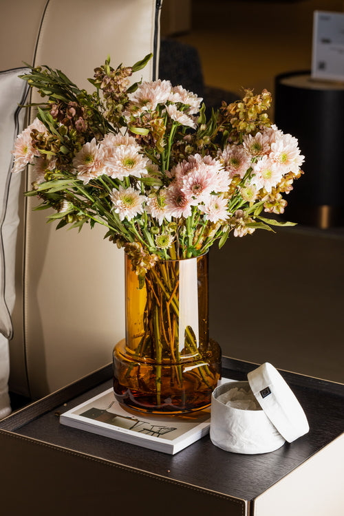Dit model in de warme amber kleur is 25 cm hoog en heeft een diameter van 16,5 cm, voor een royaal boeket bloemen. Het glaswerk straalt pure kwaliteit uit: rijk van kleur, met een verfijnde afwerking.