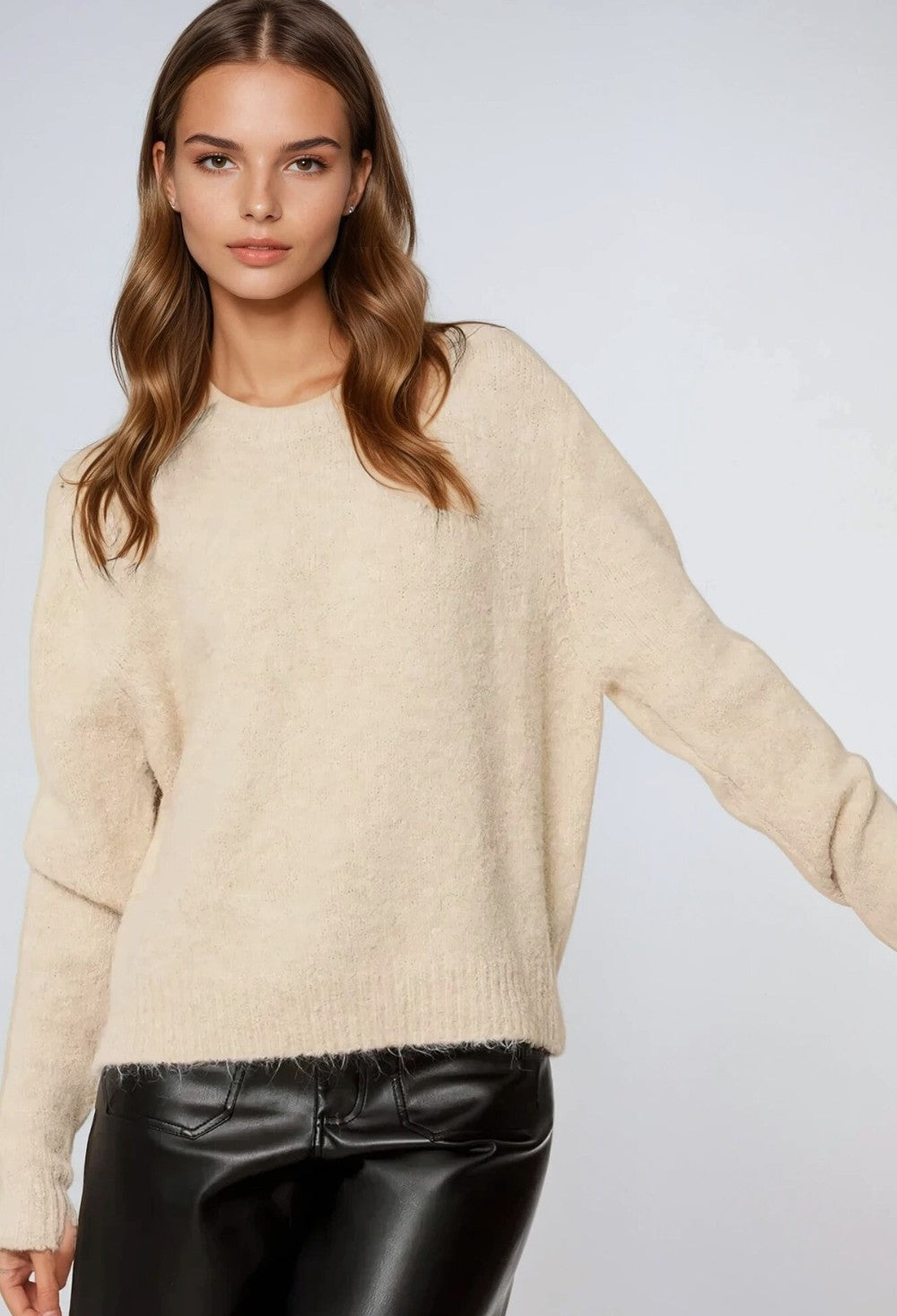 Tijdloos, veelzijdig en superzacht: een must-have basic trui in beige. Deze trui matcht moeiteloos met de rest van je garderobe. Dankzij de ronde halslijn en de comfortabele lange mouwen is hij ideaal om te dragen als warme laag onder een polo of shirtje. Op koudere dagen draag je de trui los en lekker warm met verweven wol erin verwerkt. Of je nu onderweg bent naar kantoor of juist een ontspannen weekend voor de boeg hebt. Deze trui is zo’n favoriet waar je keer op keer naar grijpt.