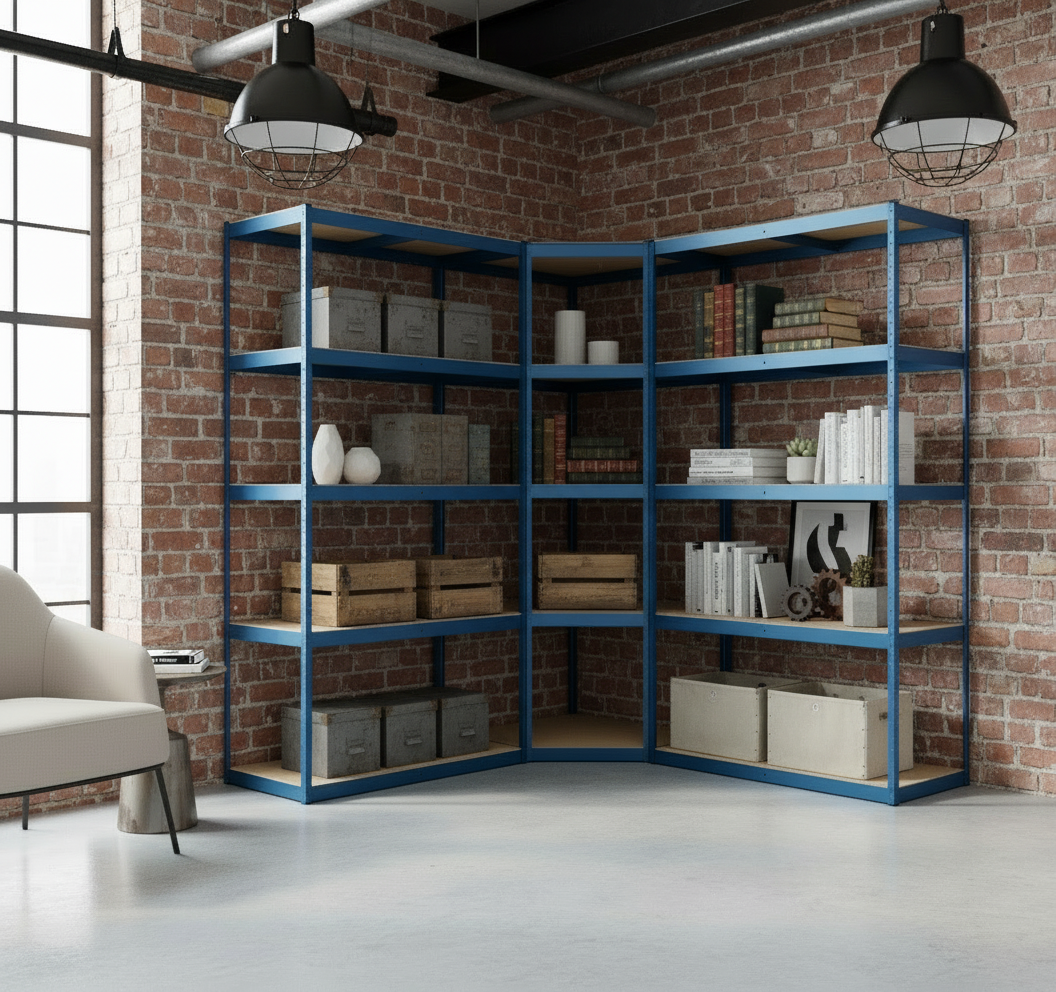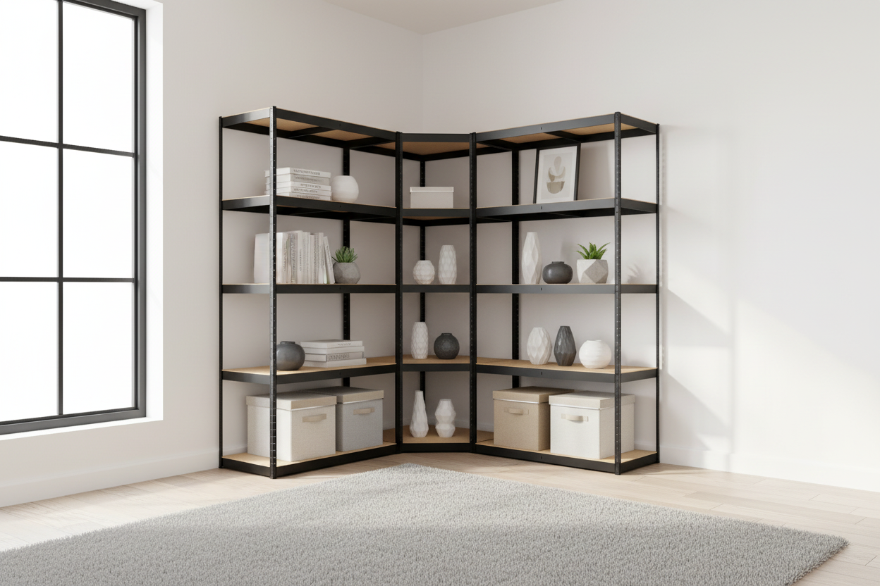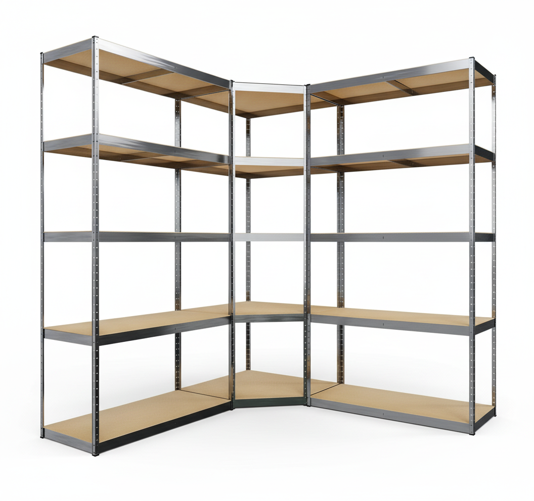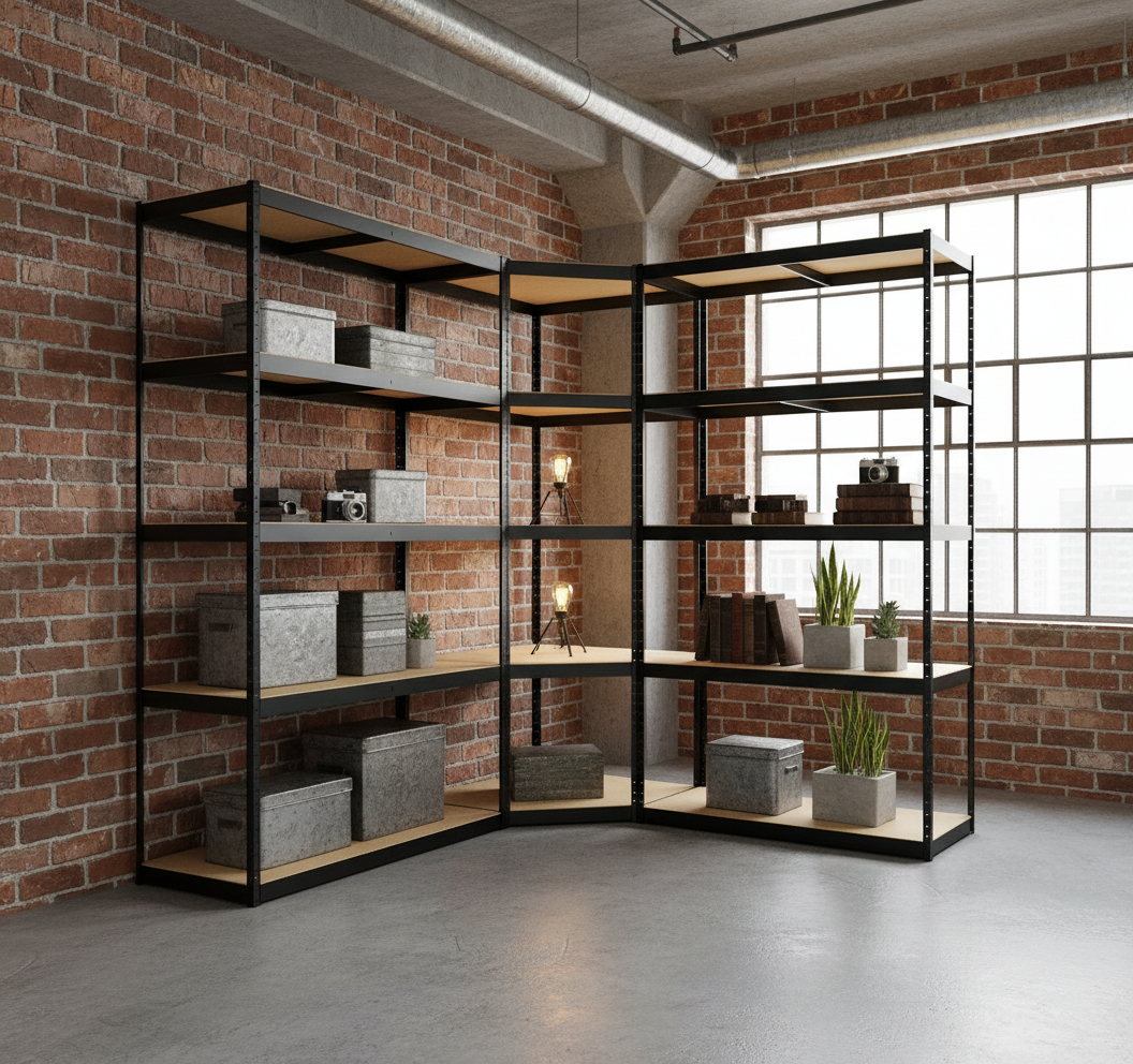 3-delige zwaar belastbare stellingkast, bestaande uit een hoekrek en 2 staande rekken. Zoek je een extreem stevig opslagsysteem voor je slaapkamer, woonkamer, werkruimte of magazijn? Die ook nog eens mooi staat in een modern of industrieel interieur? Deze stellingkast is ontworpen voor maximale draagkracht, optimale stabiliteit en slim gebruik van ruimte. Met twee identieke rekken en een hoekrek creëer je een complete, efficiënte opbergoplossing.