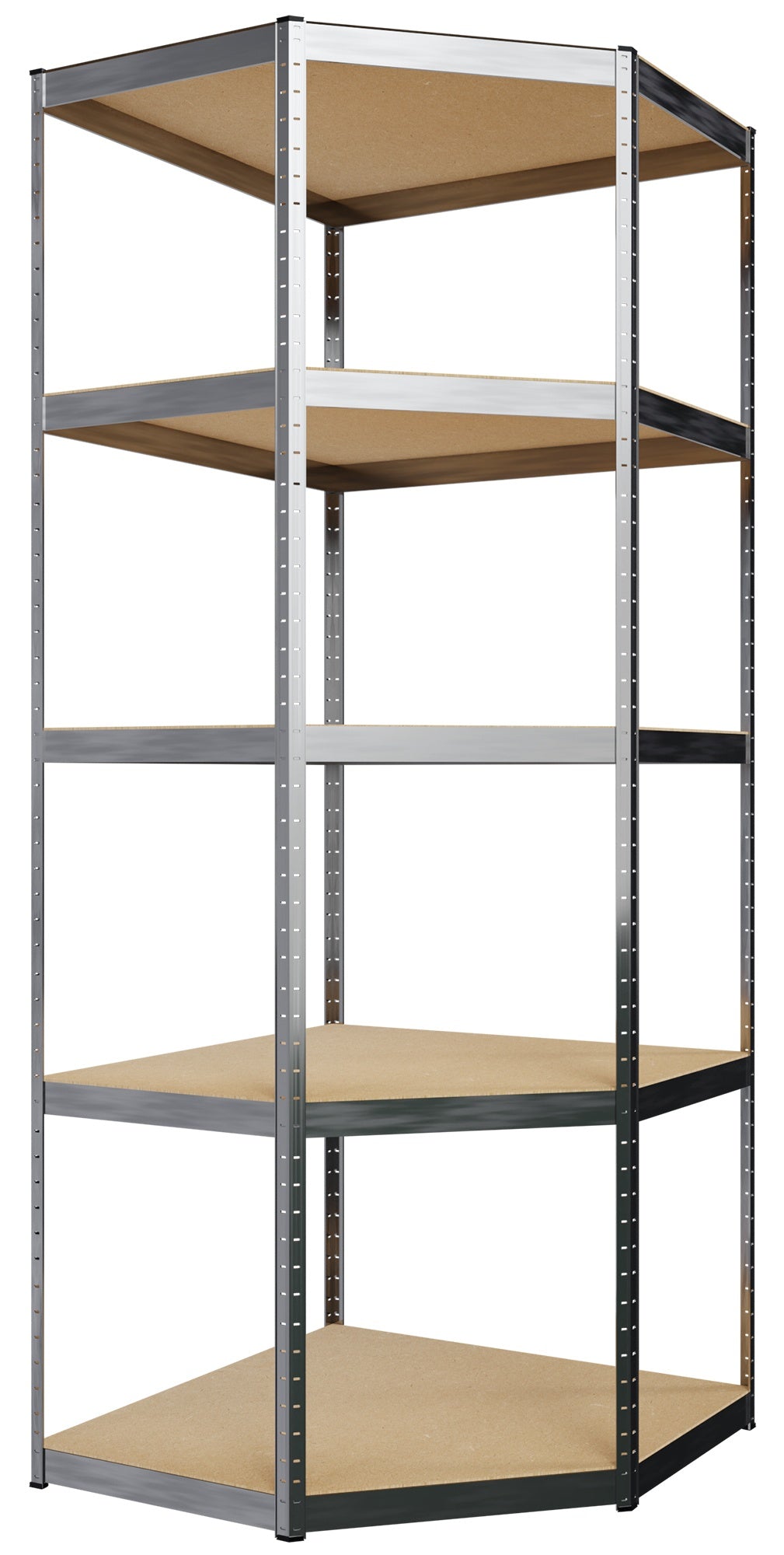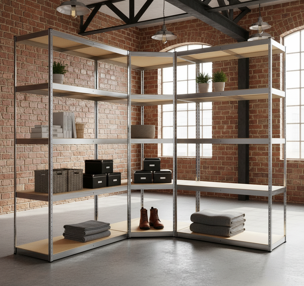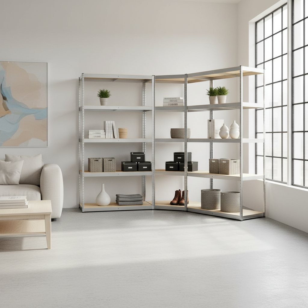 3-delige zwaar belastbare stellingkast, bestaande uit een hoekrek en 2 staande rekken. Zoek je een extreem stevig opslagsysteem voor je slaapkamer, woonkamer, werkruimte of magazijn? Die ook nog eens mooi staat in een modern of industrieel interieur? Deze stellingkast is ontworpen voor maximale draagkracht, optimale stabiliteit en slim gebruik van ruimte. Met twee identieke rekken en een hoekrek creëer je een complete, efficiënte opbergoplossing.