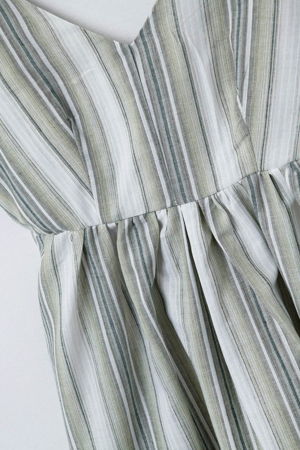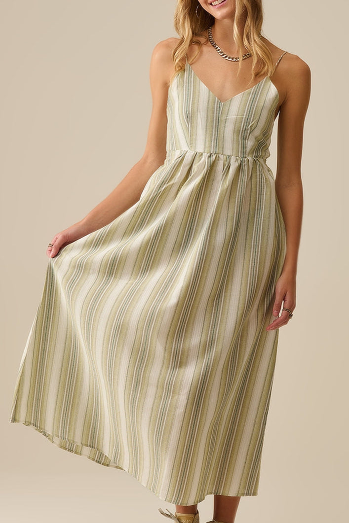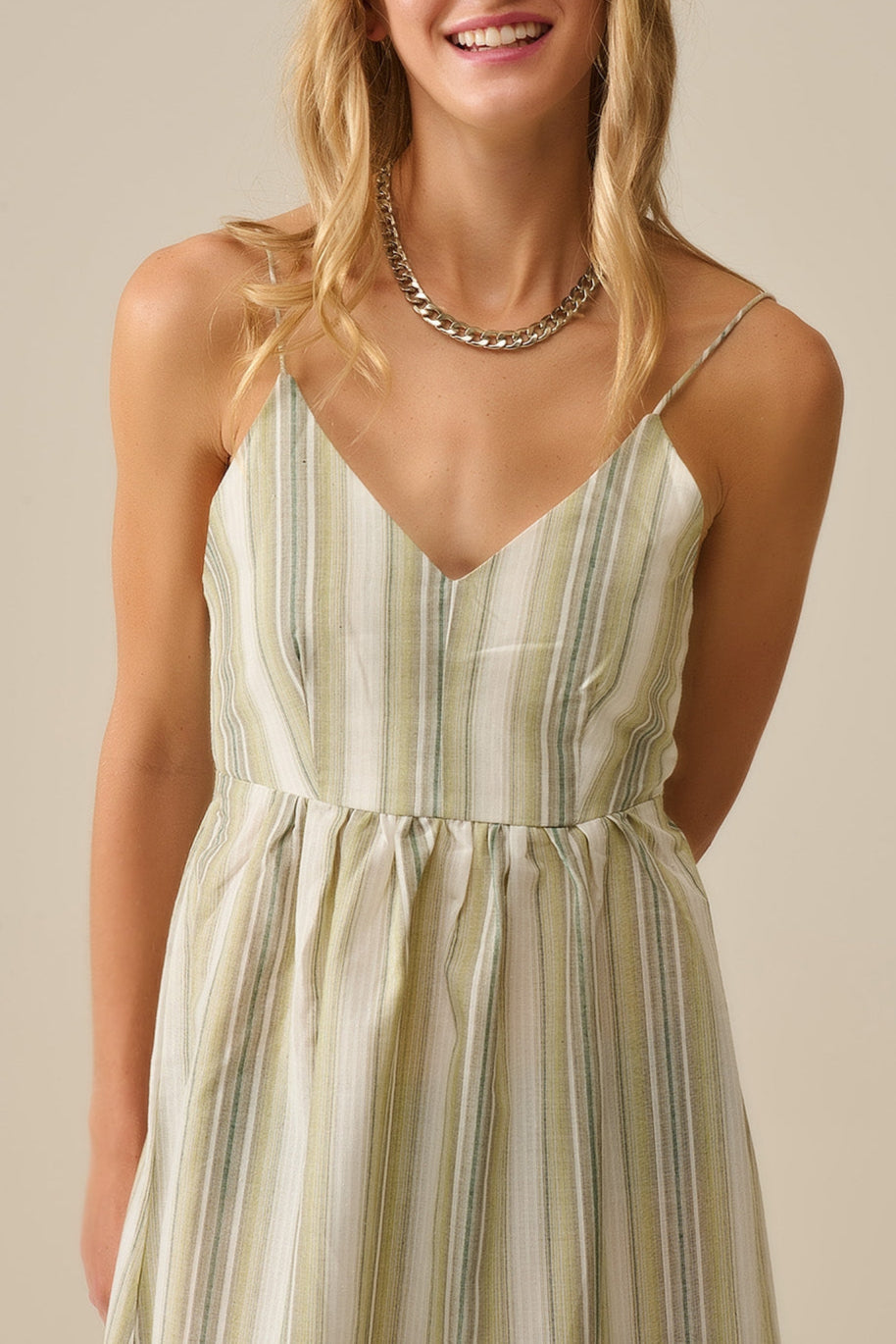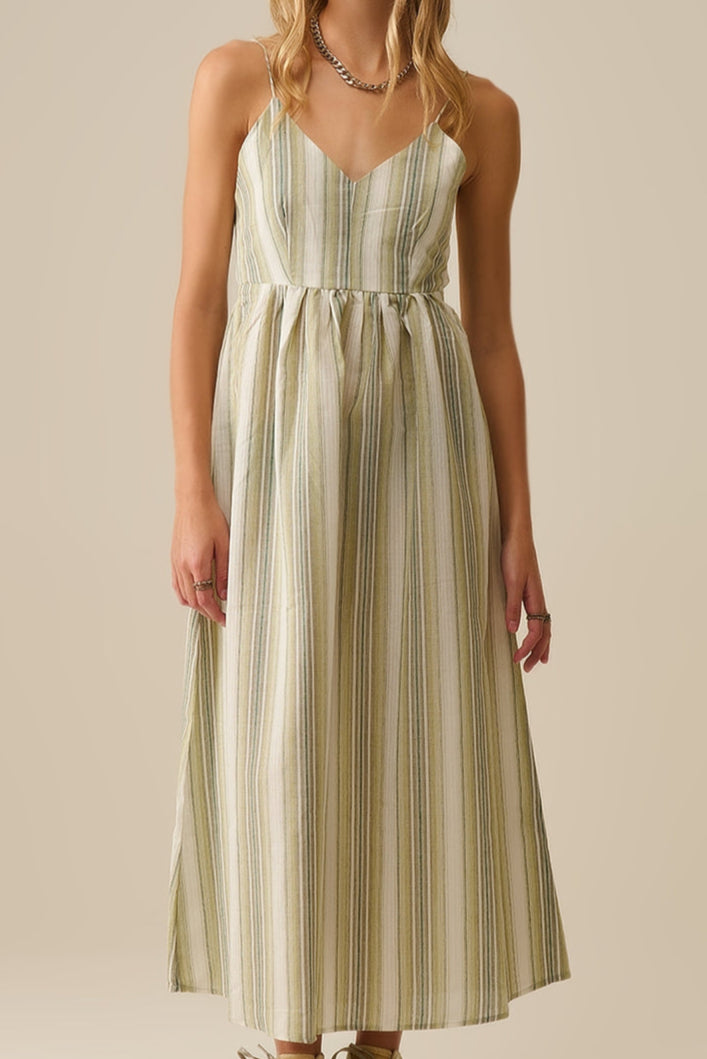 Voeg een vleugje zomerse charme toe aan je garderobe met deze gestreepte jurk met V-hals. De jurk heeft smalle, verstelbare bandjes en een aansluitende taille die overloopt in een soepel vallende rok met een lichte plooival. Perfect voor zonnige dagen, maar ook leuk voor de koudere dagen met een vestje.