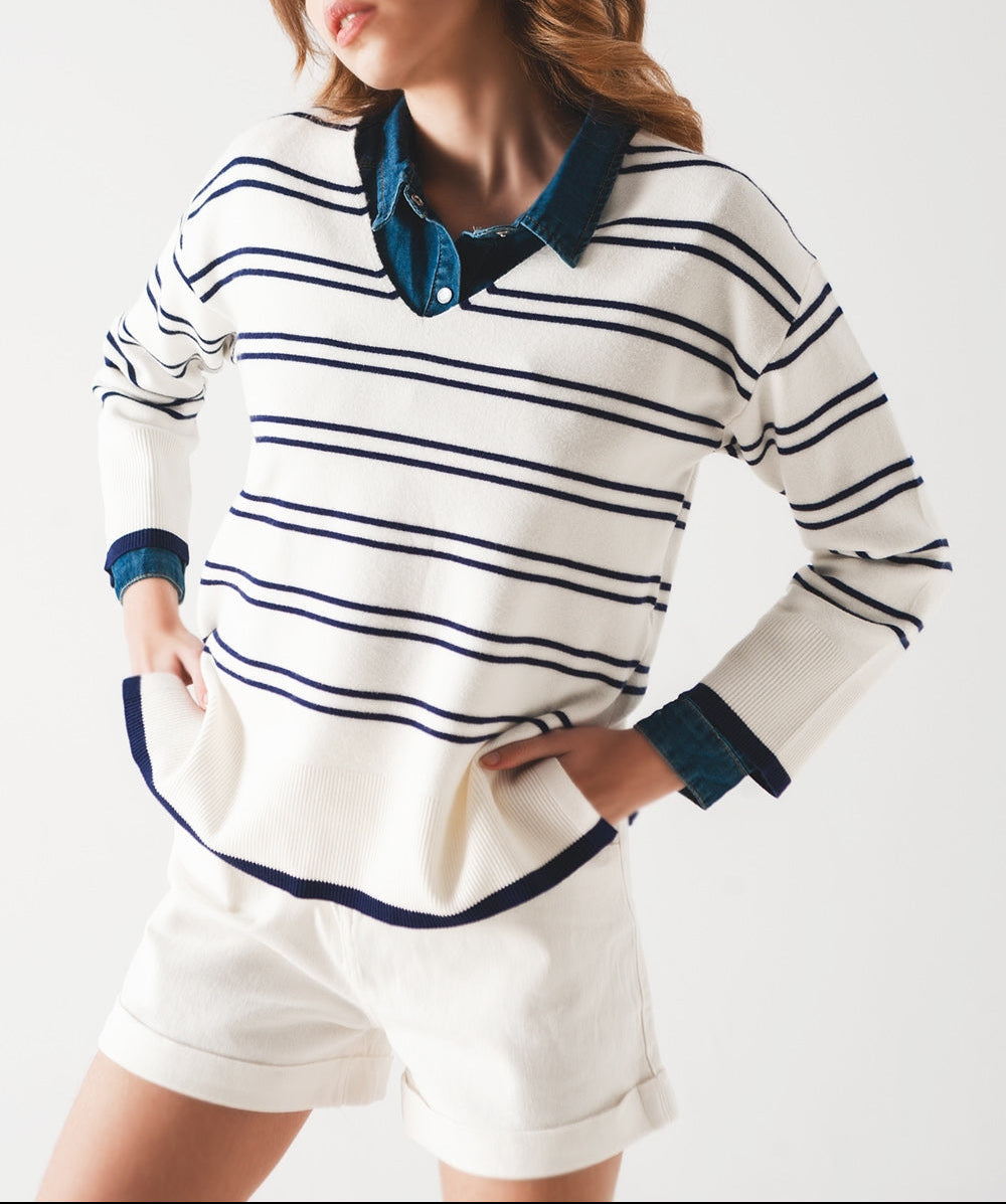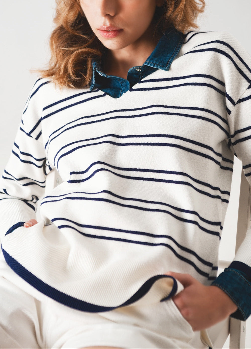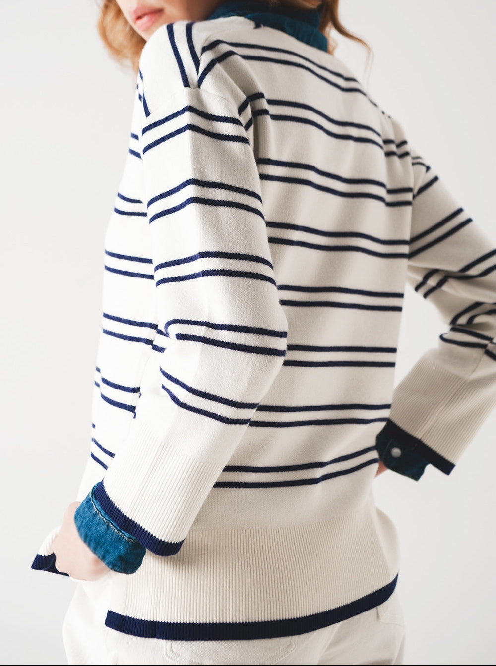 Deze trui is gemaakt van een zachte knit stof en heeft een klassiek streep patroon dat moeiteloos combineert. De relaxed fit en verlaagde schoudernaden vallen soepel en comfortabel. Een klassieke trui voor casual dagen of kantoor outfit. Draag het in laagjes onder een blouse voor de koude dagen. Mooi met een jeans, een rok of een nette pantalon. De zachte stof voelt heerlijk aan op de huid en blijft mooi in vorm.